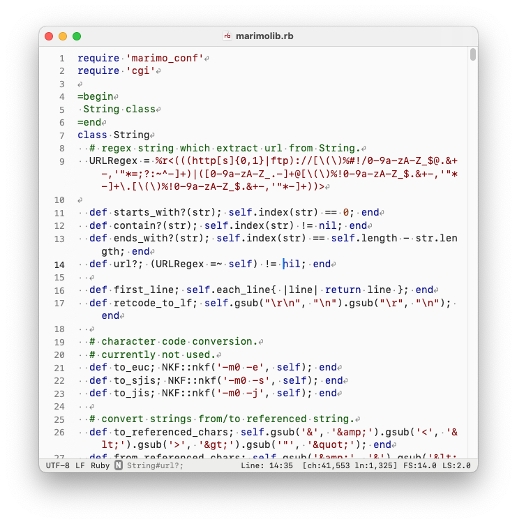 Alongside these, Ganpi includes the core capabilities expected of a modern plain-text editor: automatic detection of text encoding, line endings, and document type; unlimited undo/redo; syntax coloring and outline menus for supported languages; and word completion.